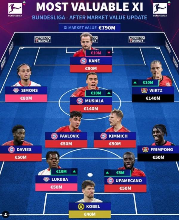 12月20日訊 《轉(zhuǎn)會(huì)市場(chǎng)》今日更新了德甲球員身價(jià),并列出了一套德甲最貴陣,拜仁6將在列,萊比錫、藥廠各2人。